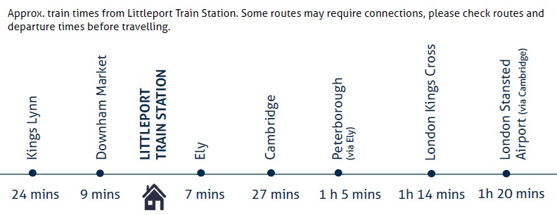 Littleport Train Station is about a 9-minute cycle or 31-minute walk from Peacock Grove, with step-free access to all platforms via a ramped subway and 330 cycle storage spaces, the station is well set up for multi-modal travel.