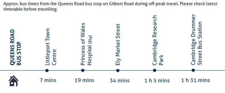 Route no.9 serves Queens Road, currently operated by A2B Travel Group with services travelling between Littleport, Ely and Cambridge. The bus stops here at 6:44am, 9:38am, 11:08am, 12:38pm, 2:55pm and 4:28pm, Monday to Saturday (except public holidays).